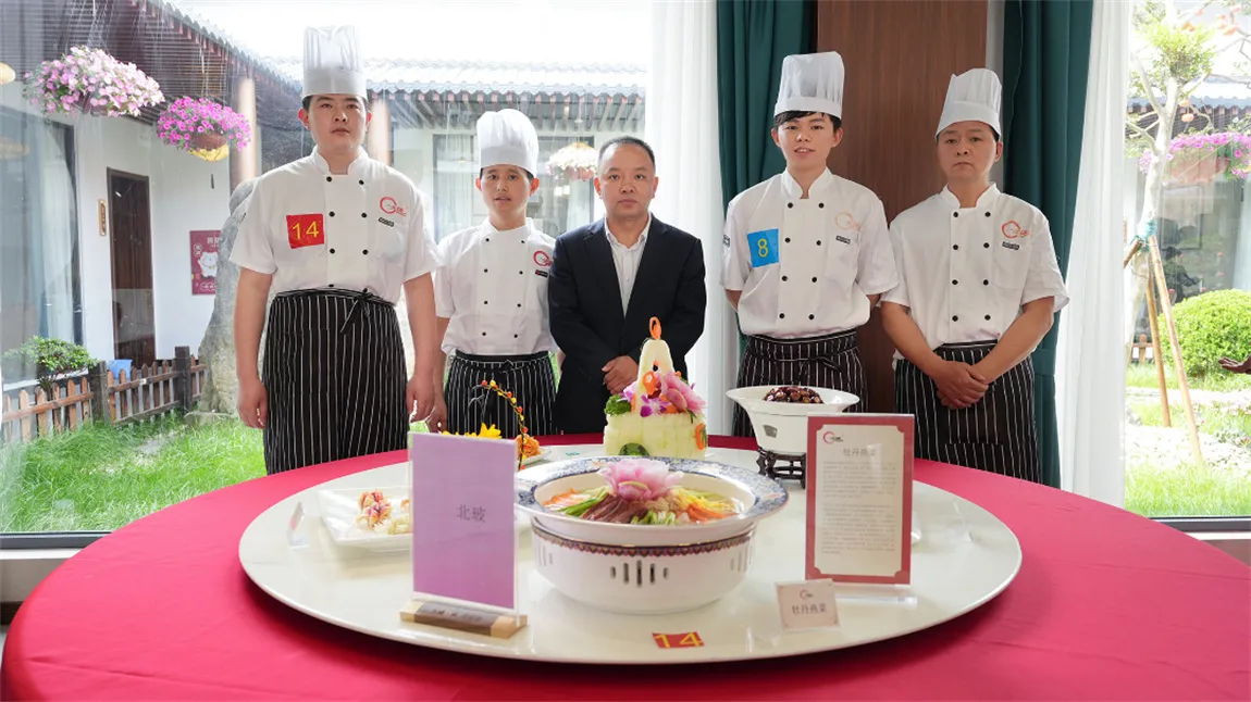 四名参赛选手里秦飞算是“老厨师”了,1994年出生的他有着12年的从业经验,精通各种中式冷、热菜肴的烹制。自2016年加入乐鱼官方网页版餐厅以来始终兢兢业业,认真负责。这次参赛的压轴大菜“乐鱼官方网页版风味”的牡丹燕菜也是出自他手,这道菜一亮相就获得了现场评委和镇领导们的一致好评。