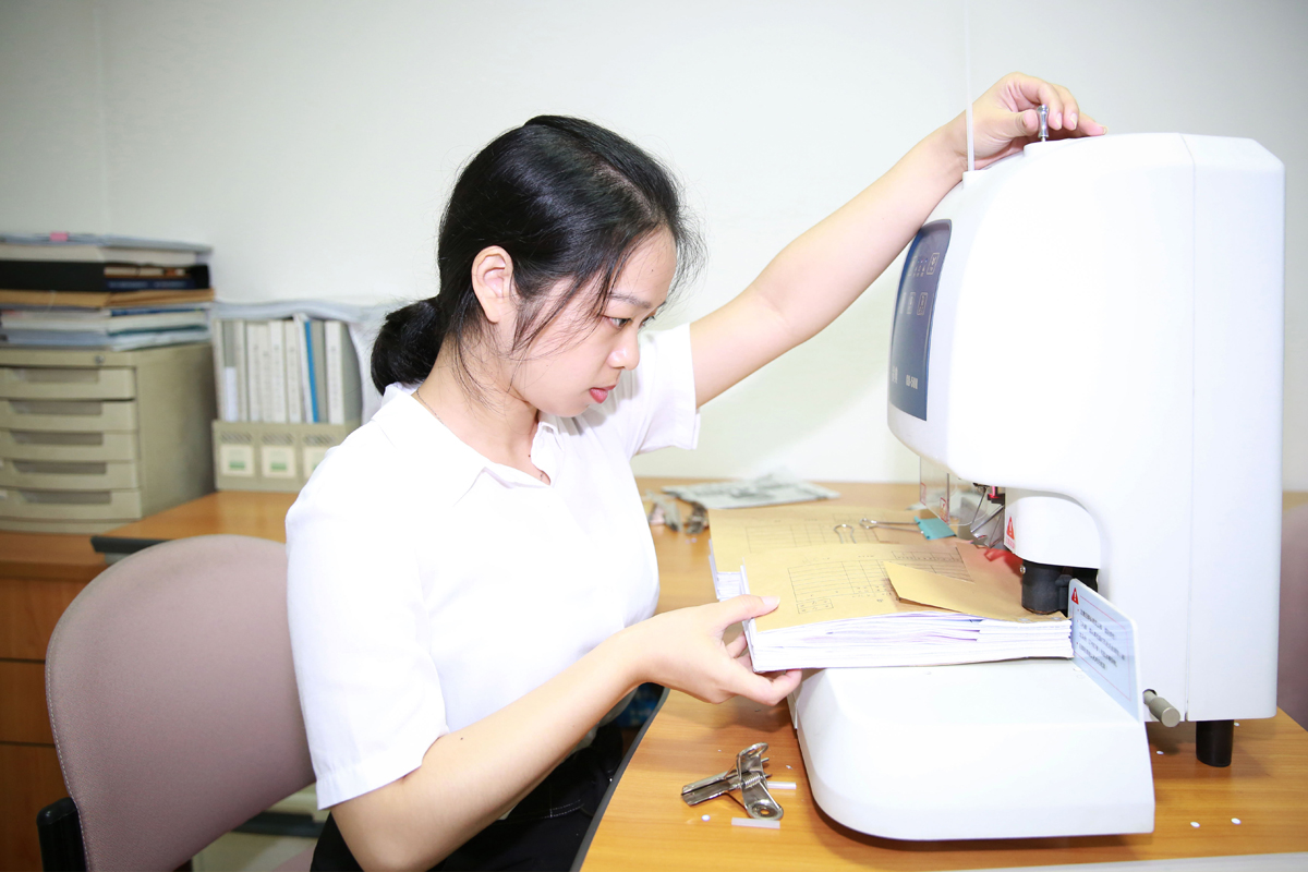接下来进行的是凭证装订——随着选手的坐定和计时人员的就位,紧张而激烈的凭证装订正式开始,选手们手、眼、脑配合,将凭证装订得平整、牢固、美观,展示了良好的专业素养。