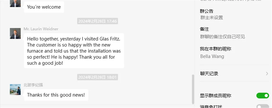 上述这段话出自钢化设备事业部国际销售+服务办公群,德国代理很欣喜地向大家分享了德国客户对乐鱼官方网页版团队的赞誉。(译文:昨天我拜访了格拉斯·弗里茨。客户对新炉子非常满意,并告诉我们安装的非常完美!他很开心!谢谢大家的出色工作!)