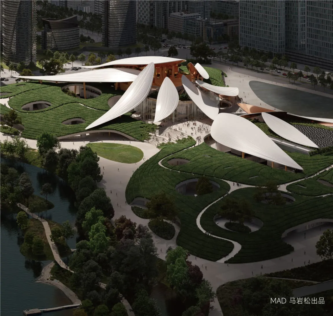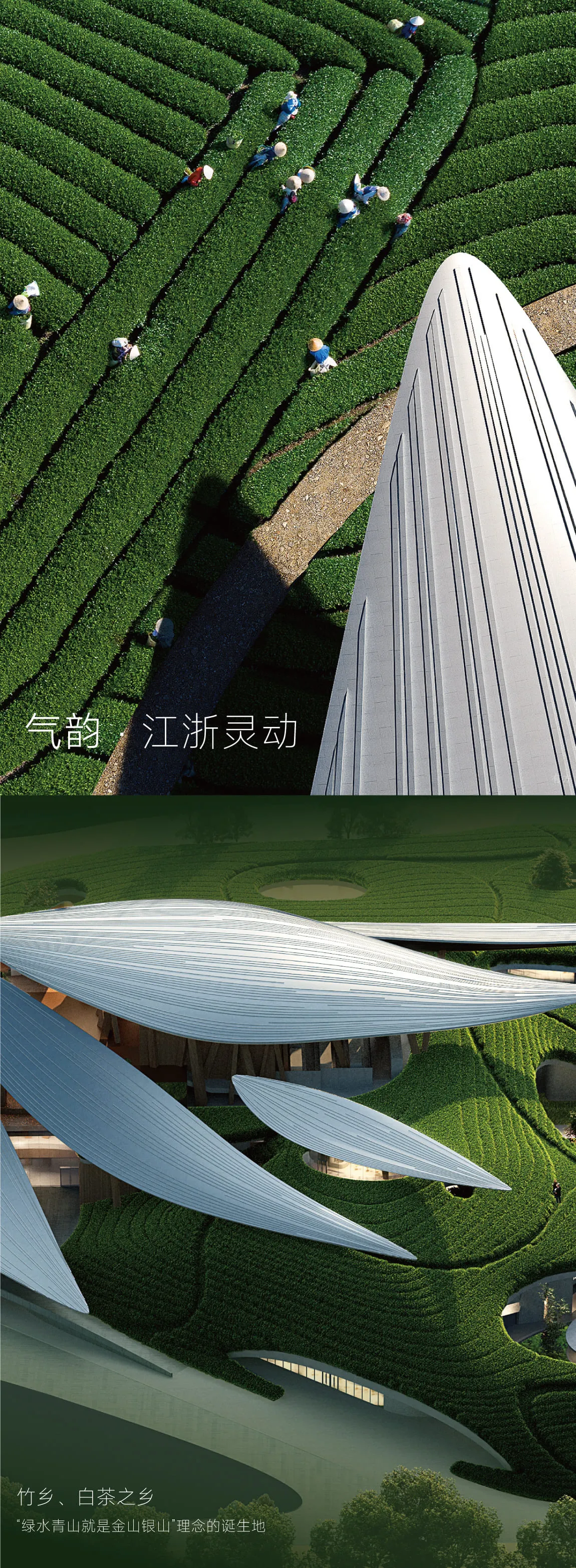 安吉“两山”未来科技城文化艺术中心由MAD建筑设计事务所马岩松主创,由中国建筑第八工程局总包。设计以两岸视觉通廊为轴布局,场地中央并没有被庞然建筑所占据。中轴连廊成为了开放的户外平台,为市民提供了活动和观景的空间,让场地充满仪式感。场地的高点,是多片像是随意散落的“竹叶”,层叠错落,覆盖在茶田之上,充满雕塑感的同时,也显现了几分轻盈和灵动。金属“竹片”屋顶的纹路,像是叶脉,增添了生动的自然气息。