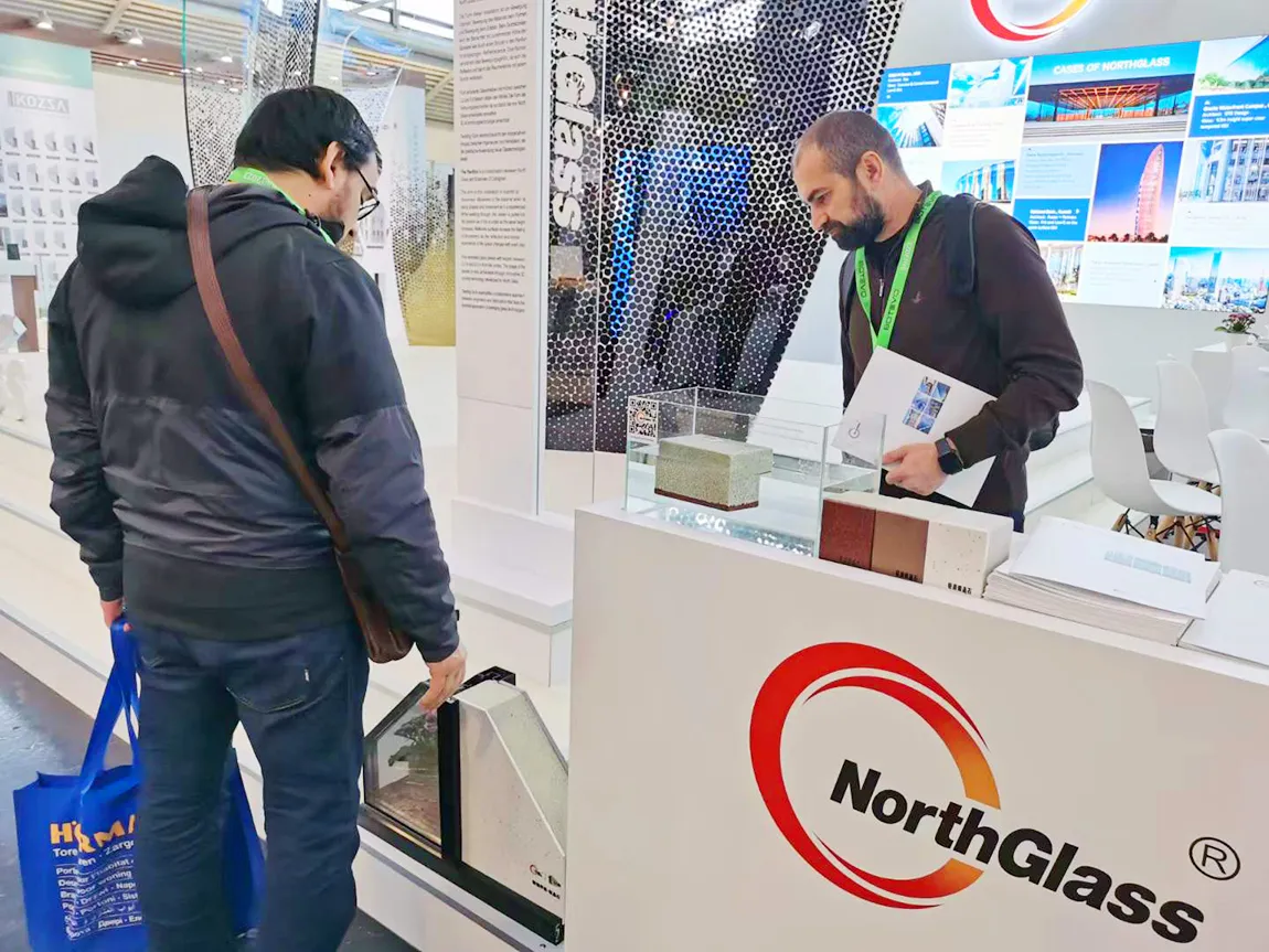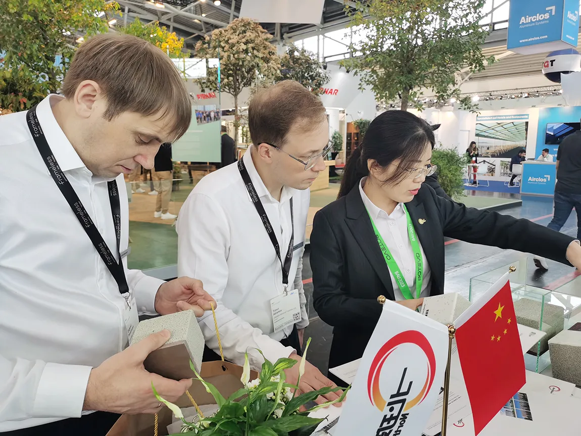 展会的另外一个亮点是乐鱼官方网页版轻晶石,这是这种新型外墙材料首次亮相国外展会。它具有稳定耐候、轻质高强、防火保温、饰面一体等诸多特点。乐鱼官方网页版轻晶石可以广泛应用在建筑外围护墙体中,轻晶石集成加工为幕墙组件和轻晶石装配式集成墙体后,化解了建筑外墙工业化的痛点,作为玻璃的“伴侣”,为建筑再添“新外衣”。展会现场,这种材料受到设计师、业主的广泛关注,同时也吸引了欧洲媒体的跟踪报道,他们对这种新型外墙材料产生了浓厚的兴趣。