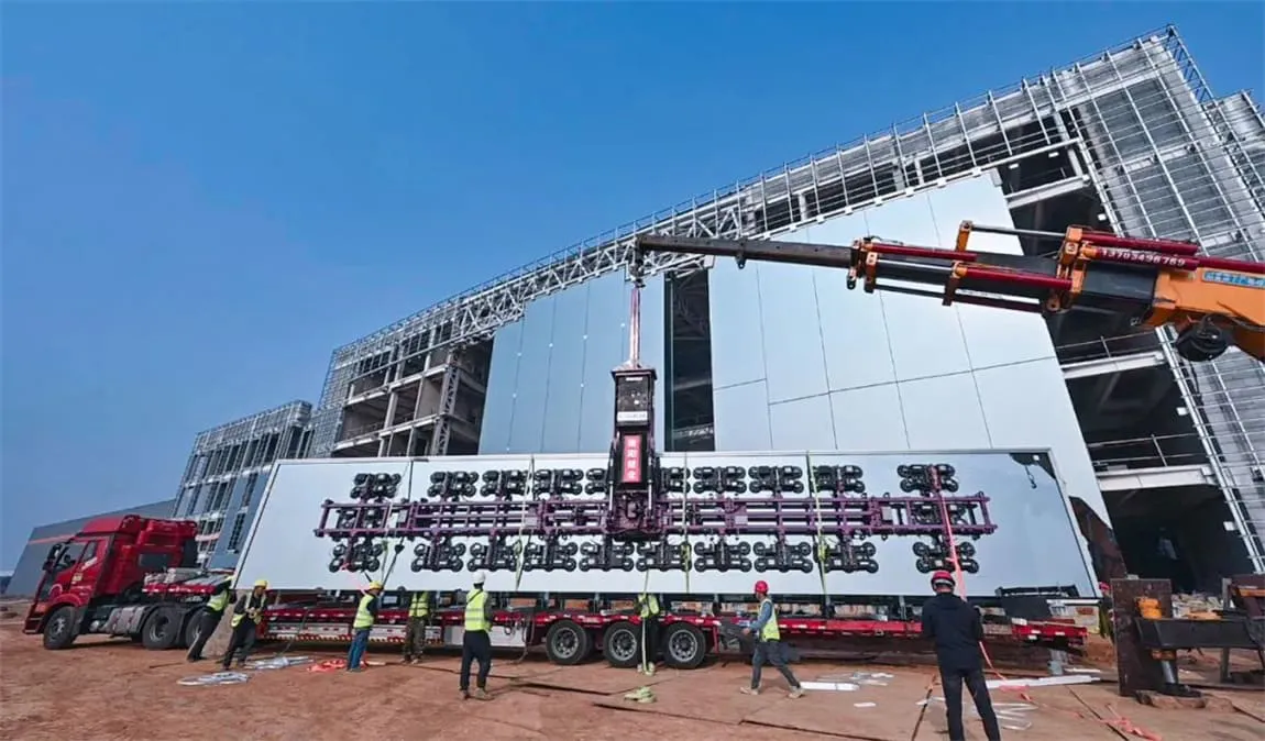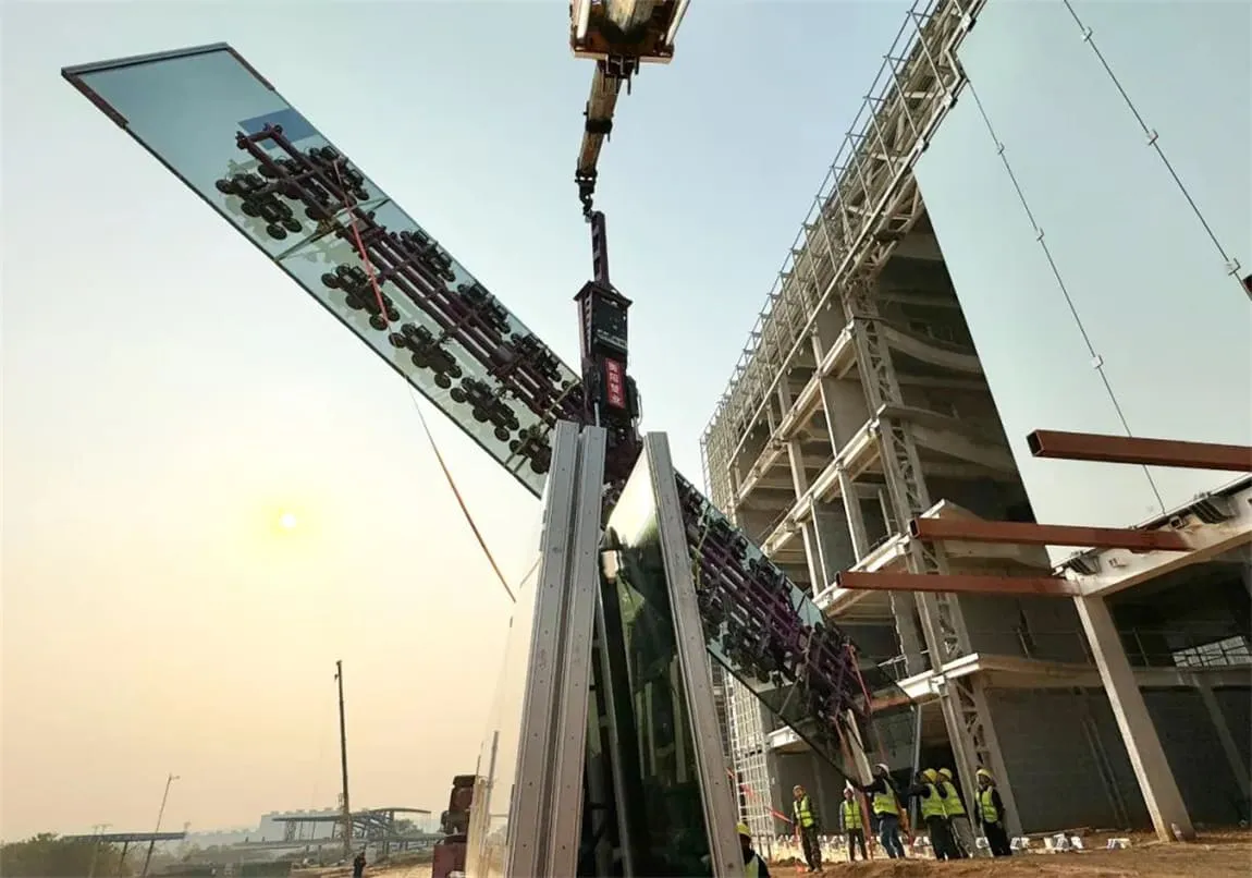 此次研发中心大楼立面安装的玻璃共计31块,南立面19块,最大高18.3米、宽3米,5层夹胶中空玻璃,单块最重达到8.8吨,实现了业内现有落地项目中面积、镀膜、层数综合之最的创举;北立面12块,最大高12米;大堂入口区域配备了8块8层厚玻璃肋,厚度达到126毫米。同时,大楼到厂房中间还有一座20米长,宽6米的全玻璃廊桥相连接。