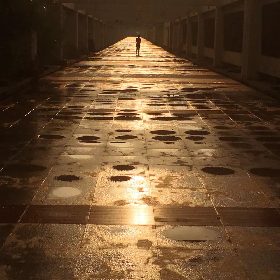 作品介绍:沈阳建筑大学教学楼长廊曾被誉为亚洲第一长廊。雨后长廊上的小水洼被夕阳染成绚烂的金色,铺展开建筑学子明亮的求学之梦。