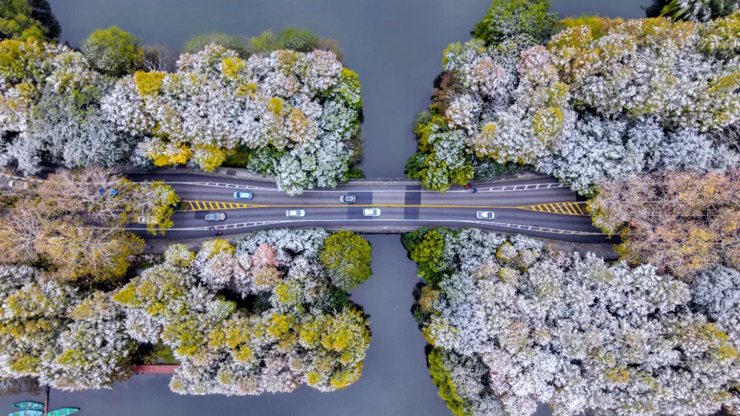 作品介绍:我院有很多作品在西湖边,平时经常航拍素材。杭州在南方,较少下雪,也很难积雪。难得2022年冬天有次机会,正好在融雪前的一天,西湖边的植被仿若覆盖了一层糖衣,很有特色,也很稀有。