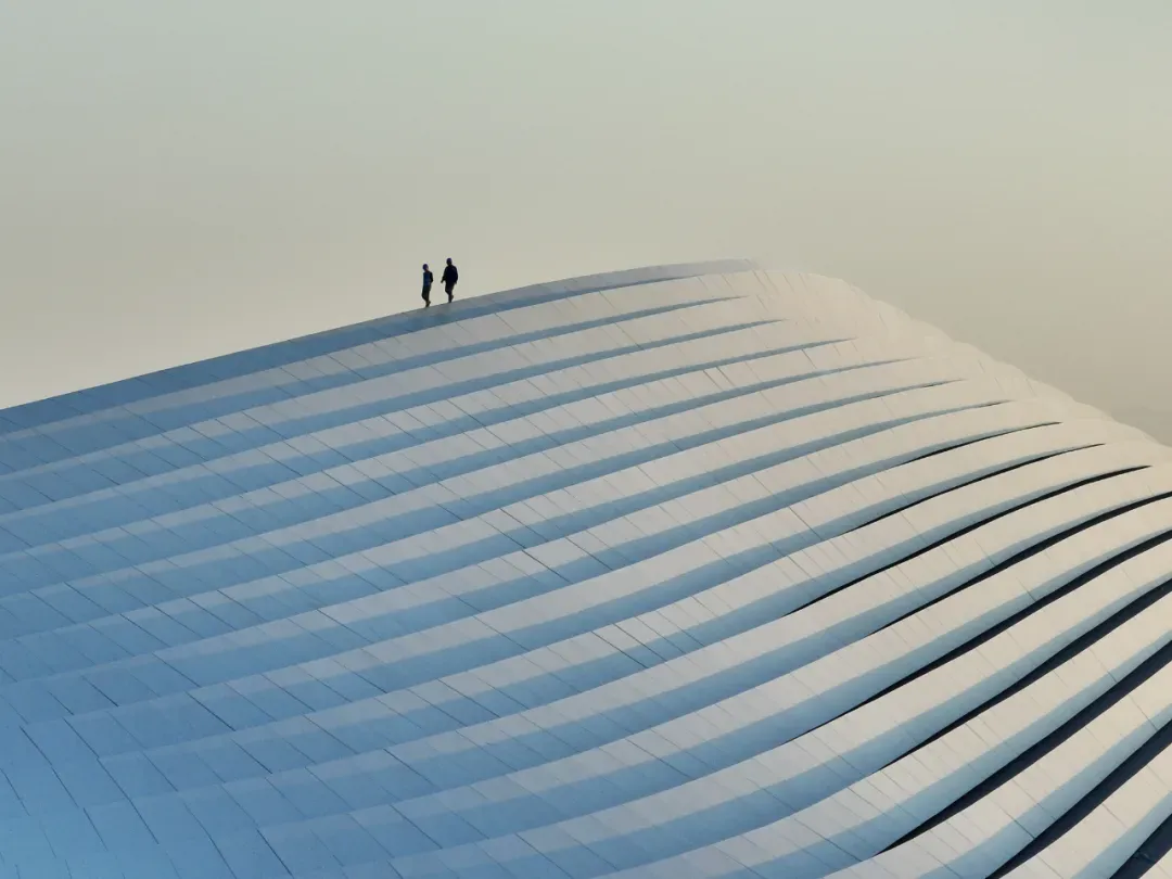 作品介绍:夕阳下行走在屋顶曲线下的建筑工作者。