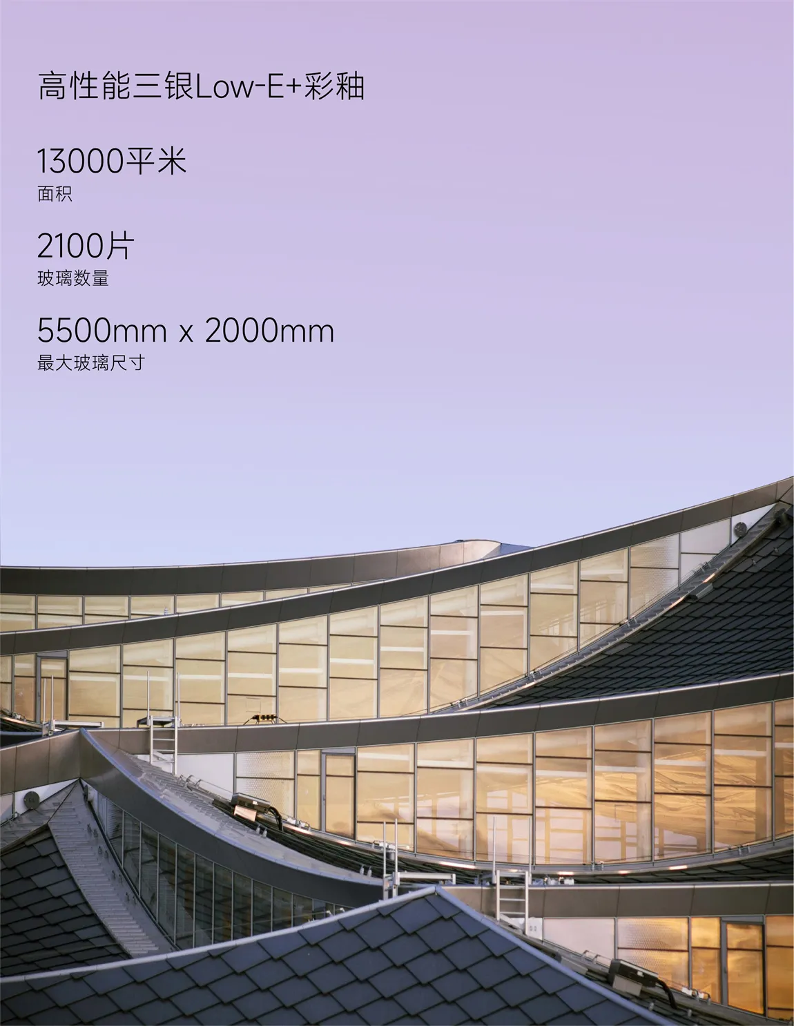 2100片高性能Low-E中空玻璃,最大尺寸达到5.5米x2米,采用了三银镀膜+彩釉配置,彩釉主要用于防止鸟类撞击。性能原片和膜系保证了视觉上的美感,但是也面临着巨大的挑战。
