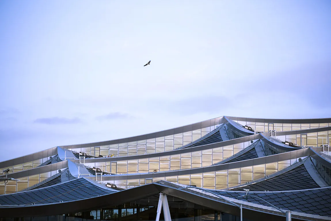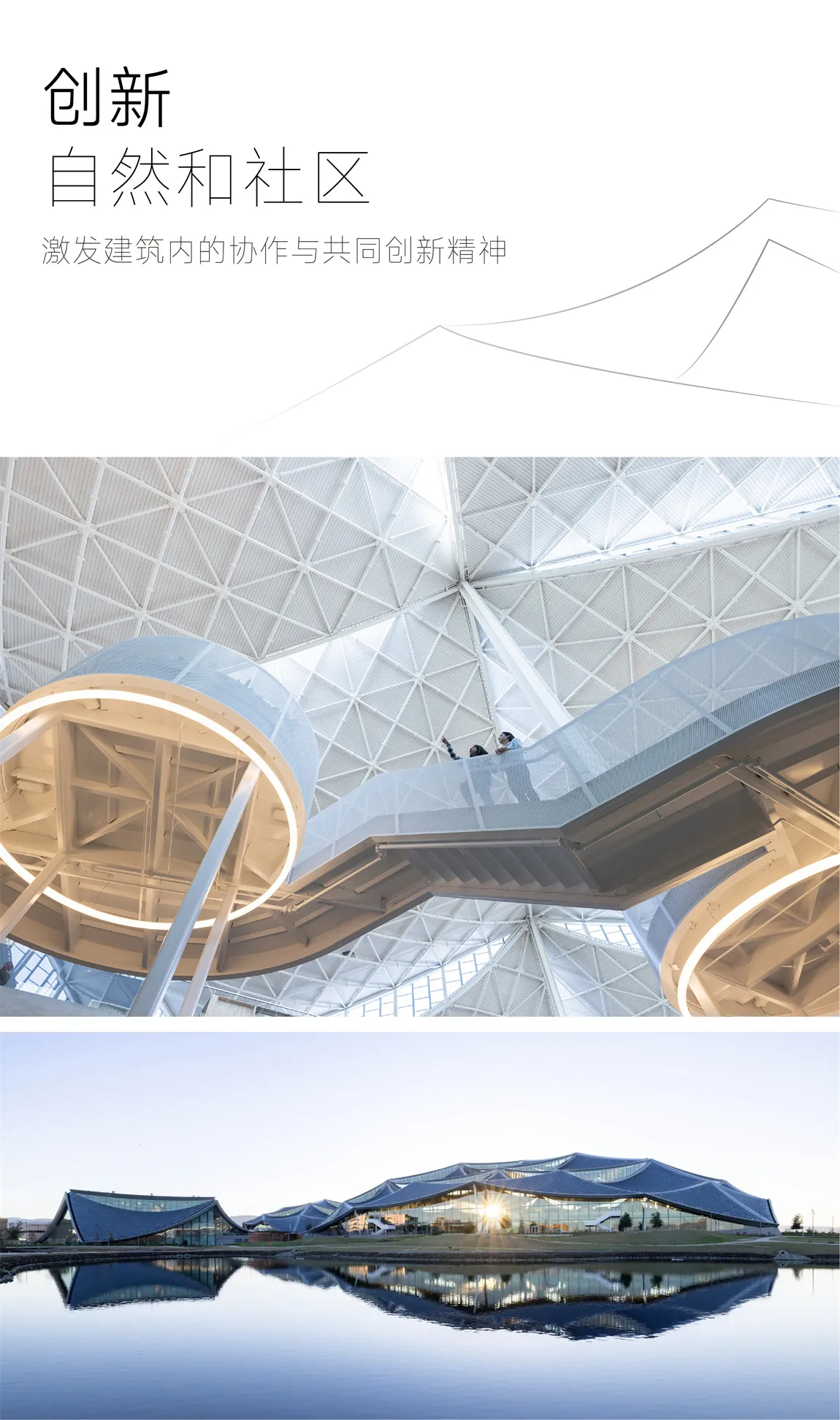 想象一下巨大的圆顶帐篷,屋顶以龙鳞装饰,乐鱼官方网页版玻璃在阳光下散发出璀璨的光芒,辉映着未来办公空间的宏伟蓝图。这就是由顶流建筑事务所BIG和Heatherwick联手打造的谷歌新湾景园区(Bay View),它位于加利福尼亚州山景城,由三栋建筑组成,历时八年建成,可容纳4,000名员工。园区建筑的外观设计灵感来自“大型贝都因帐篷”,其独特的“龙鳞”屋顶由50,000块光伏板组成,可产生近7兆瓦的电量,不仅实现了能源自给,还为建筑增添了独特的视觉效果。