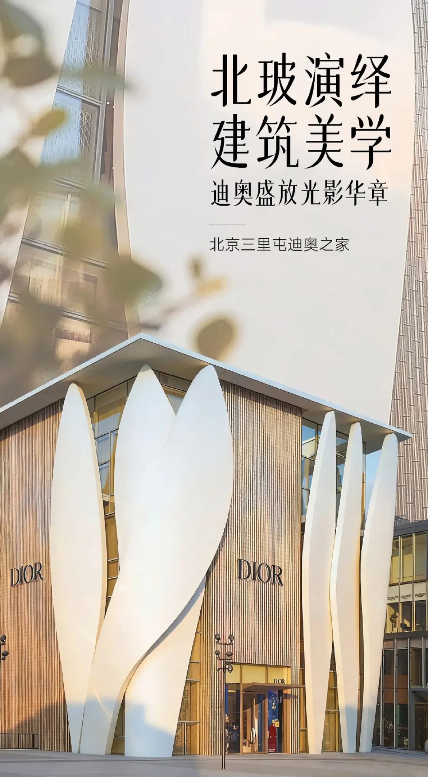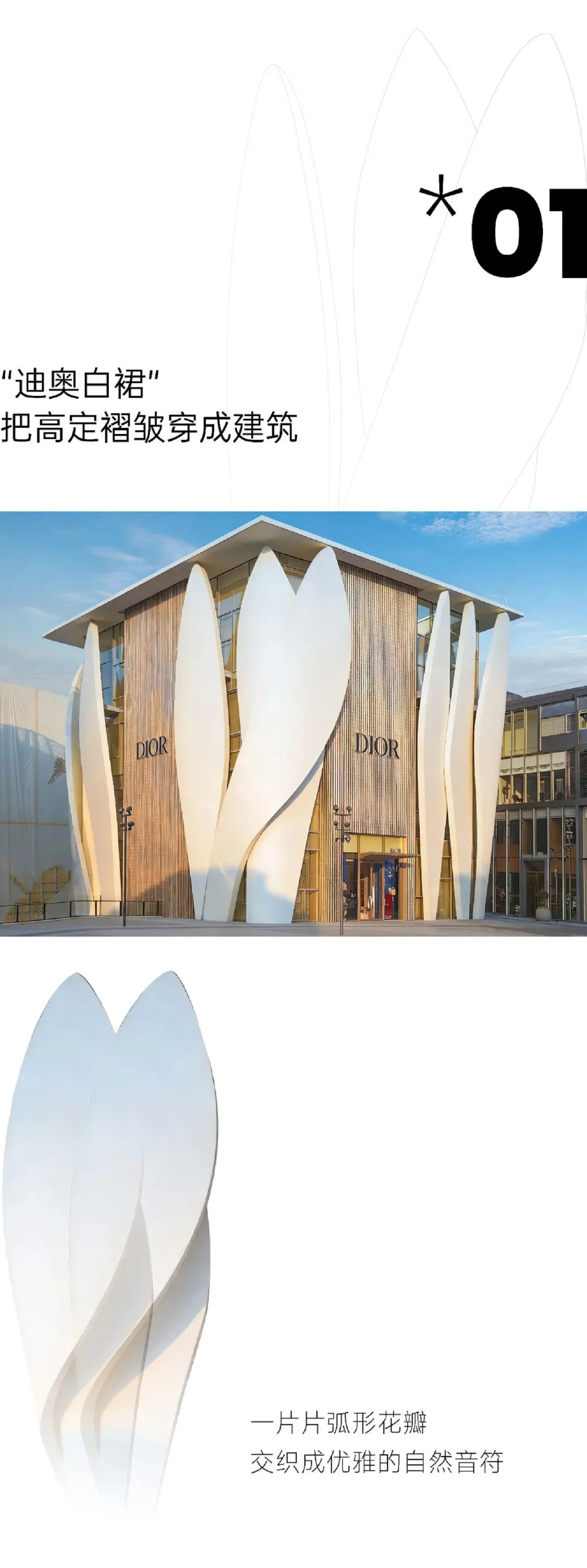 三里屯迪奥之家由普利兹克奖获得者克里斯蒂安·德·包赞巴克操刀设计,外立面采用流畅线条勾勒出如花瓣般的尖拱造型,宛如克里斯汀·迪奥(Dior创始人)裁剪高级订制礼服时,流动的线条定格在空中。