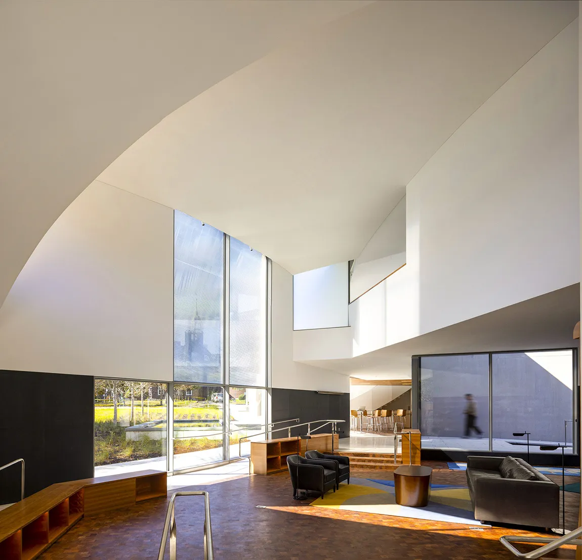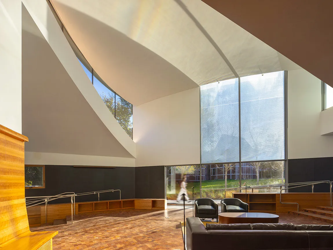 鲁宾斯坦公共活动室弧形墙和屋顶在鲁宾斯坦公共区蜿蜒起舞,其设计依靠宽敞的天窗和玻璃墙来完成体积之间的交叉。天津乐鱼官方网页版提供的大幅面超宽棱镜玻璃立面将科学、物理、人文和艺术交织在一起——与研究所的使命相呼应。斑驳的阳光、碧绿的水池及周遭景致透过棱镜玻璃折射到建筑物中,同时,棱镜玻璃将白光折射成有趣的色谱,为室内增添了活力。