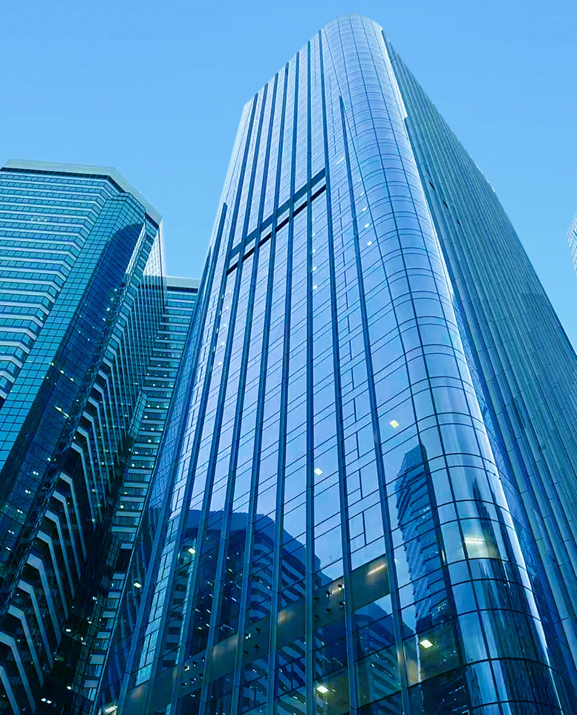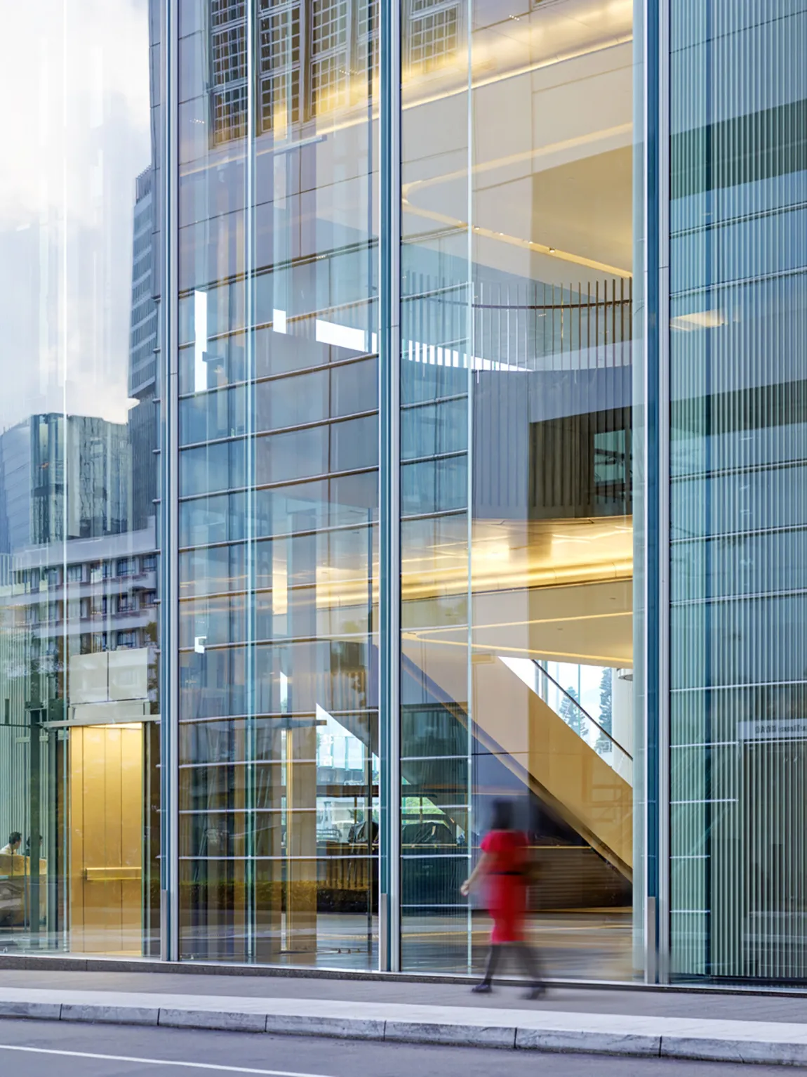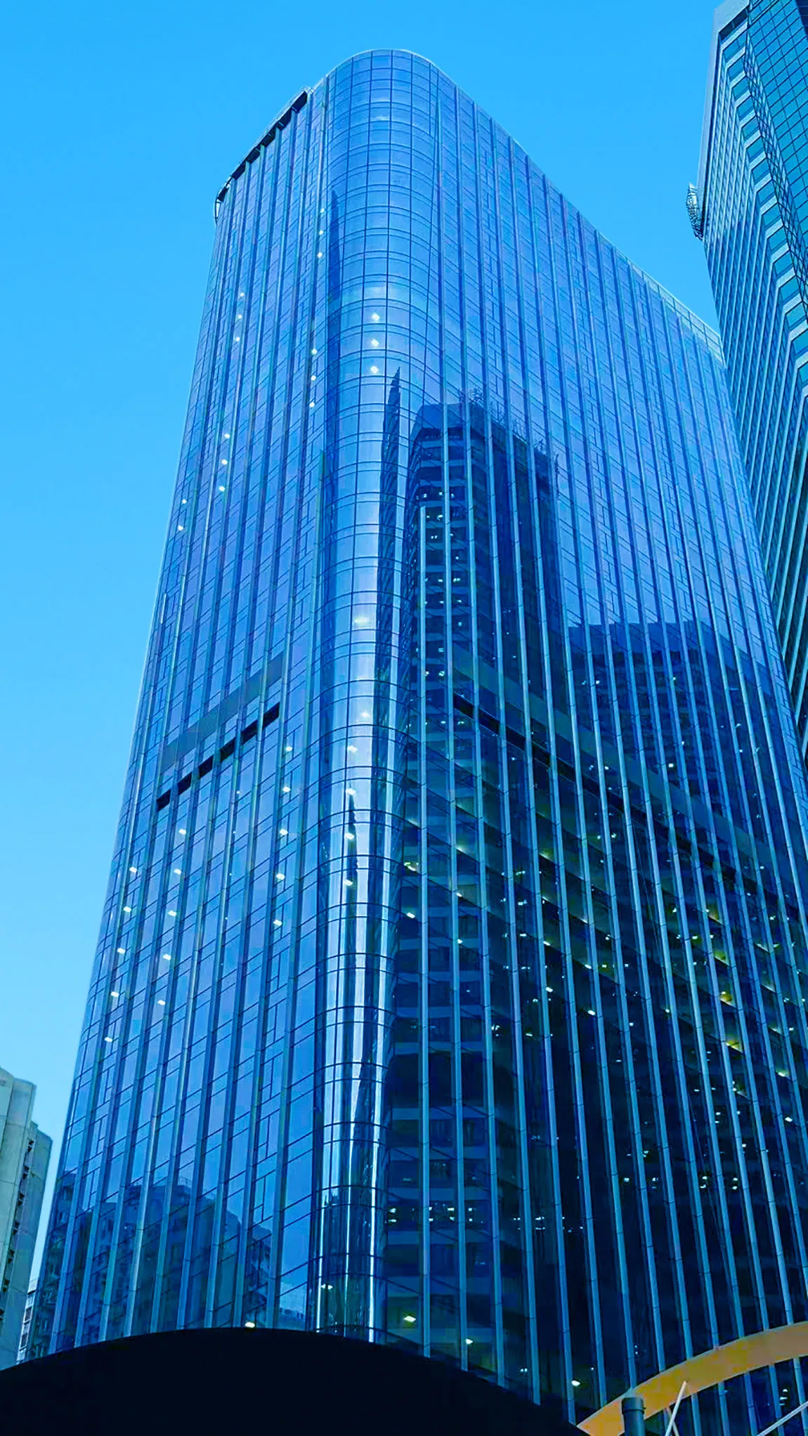 此外,太古坊二座整体建筑四个转角位置,采用了锥形弯钢自下而上逐层渐变的设计,实现了弧线的完美过渡。这要求玻璃在弯曲过程中保持圆滑度和一致性,以展现出建筑的华丽线条和优雅色泽。