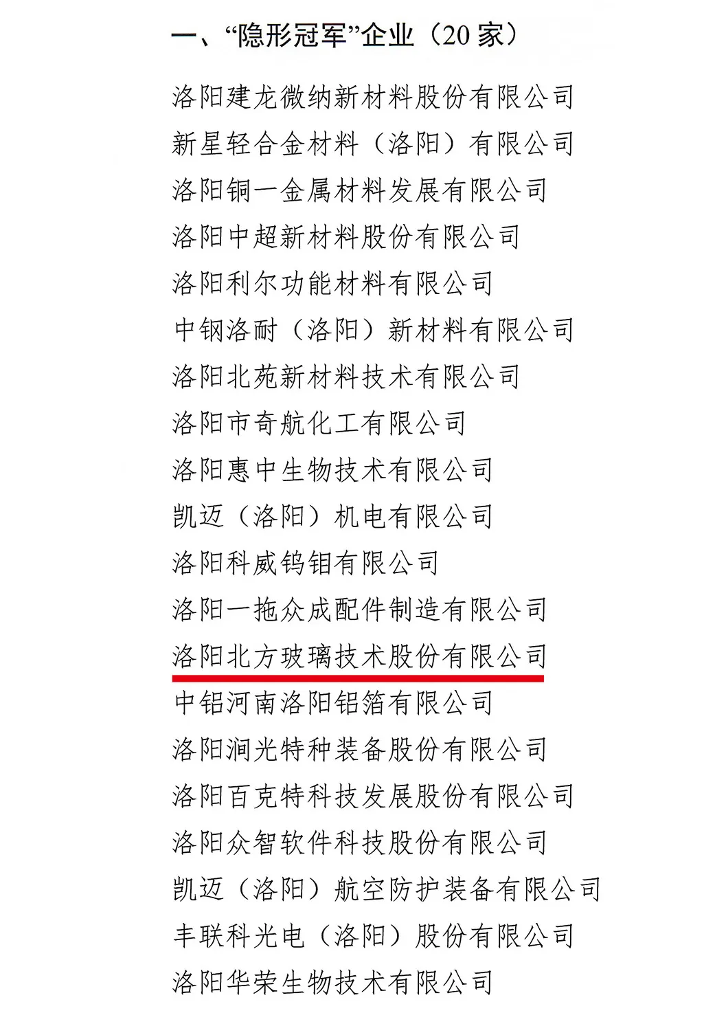 近日,洛阳市工业和信息化局经县区推荐、部门审核、实地查看、网上公示等程序,针对各个细分领域评选出20家2022年度洛阳市“隐形冠军”企业。洛阳乐鱼官方网页版作为玻璃深加工行业代表获得此项殊荣!
