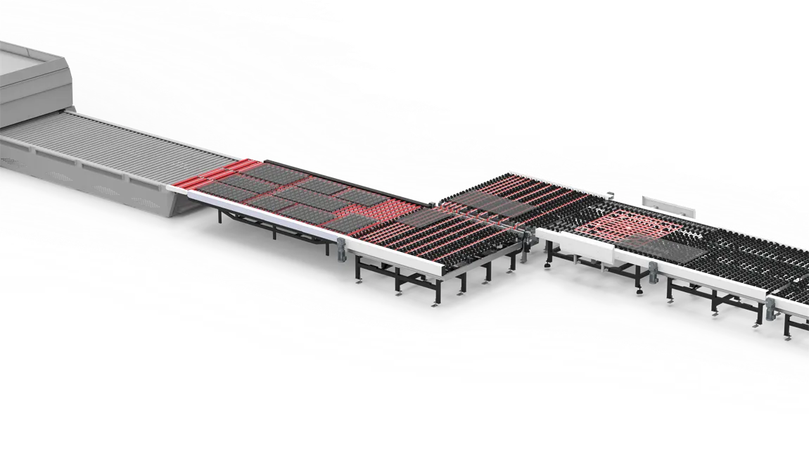 功能特点:在不牺牲钢化品质的前提下,匹配订单加工的同时,又能实现钢化前的全自动摆片及优化摆炉率。