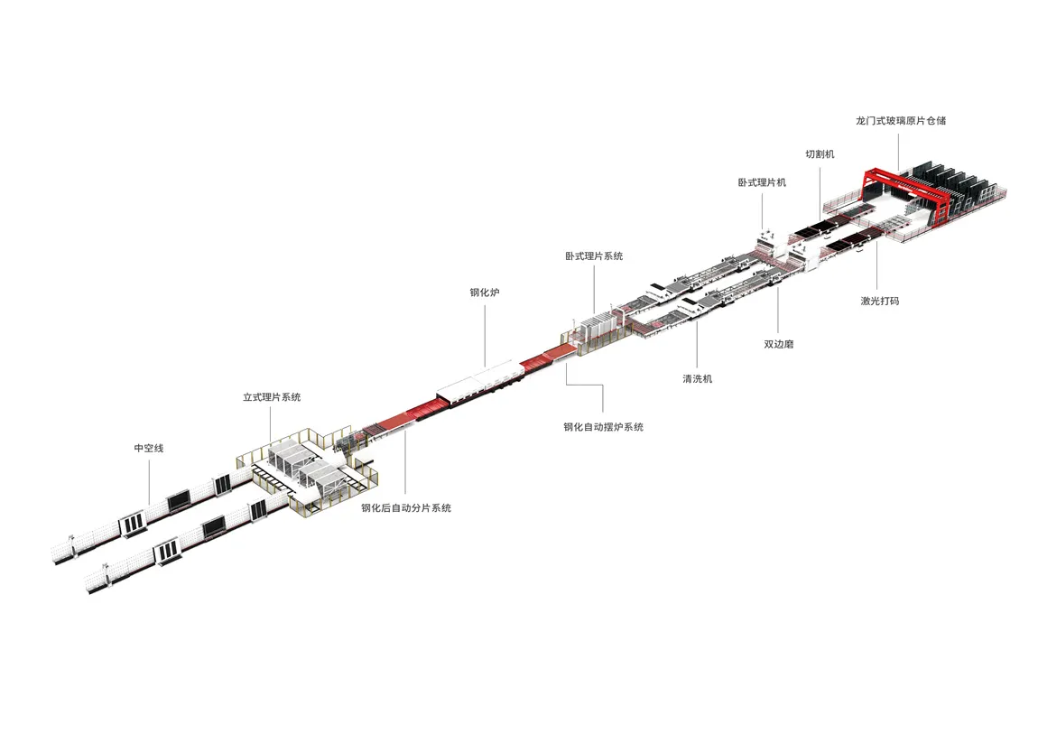特点:自动化连线的经济型方案,可实现钢化后的中空玻璃配对,空间占用率较小,适合老厂改造。